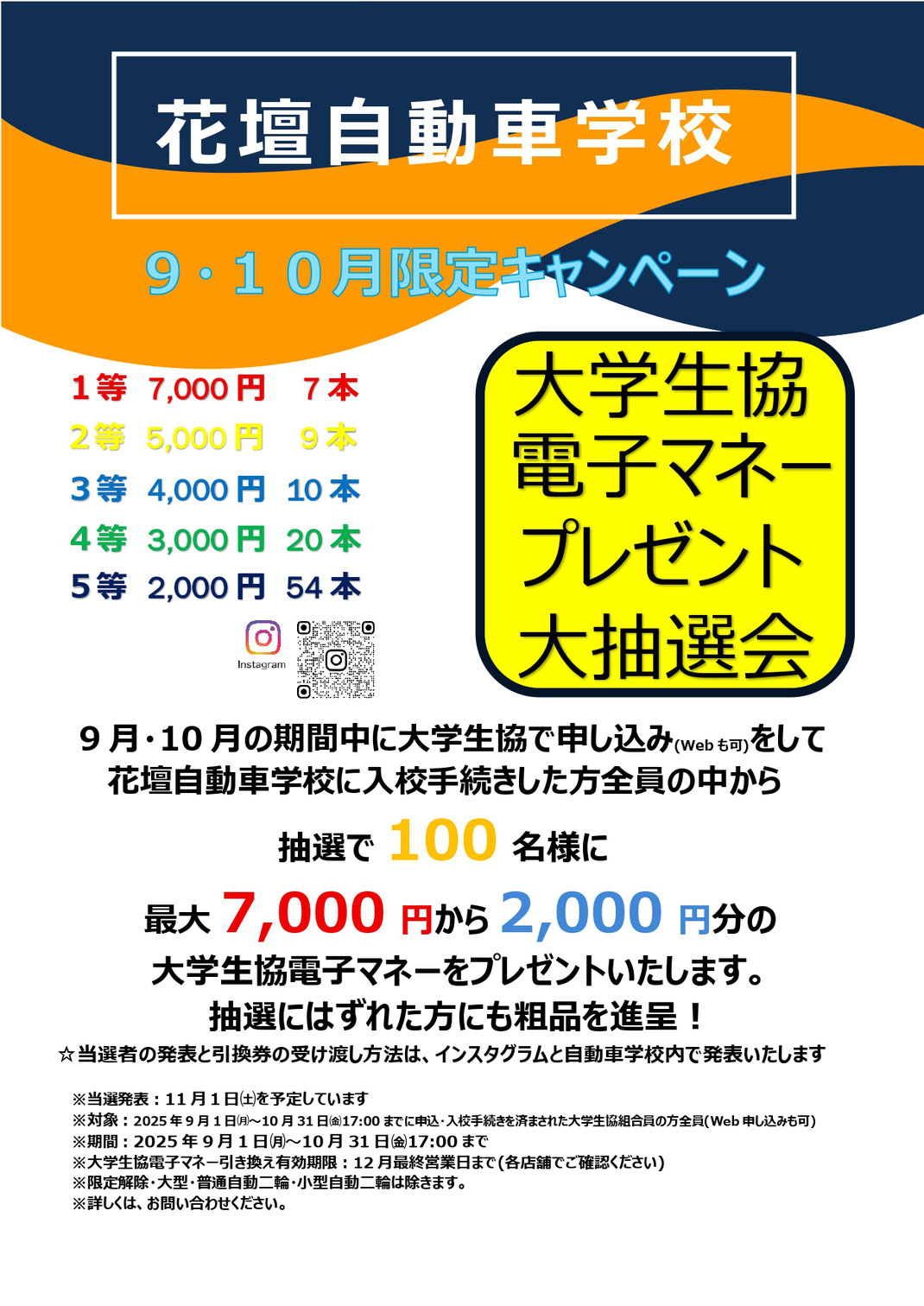 9月・10月の期間中に大学生協で申し込み(Webも可)をして、花壇自動車学校に入校手続きをされた方全員の中から抽選で、