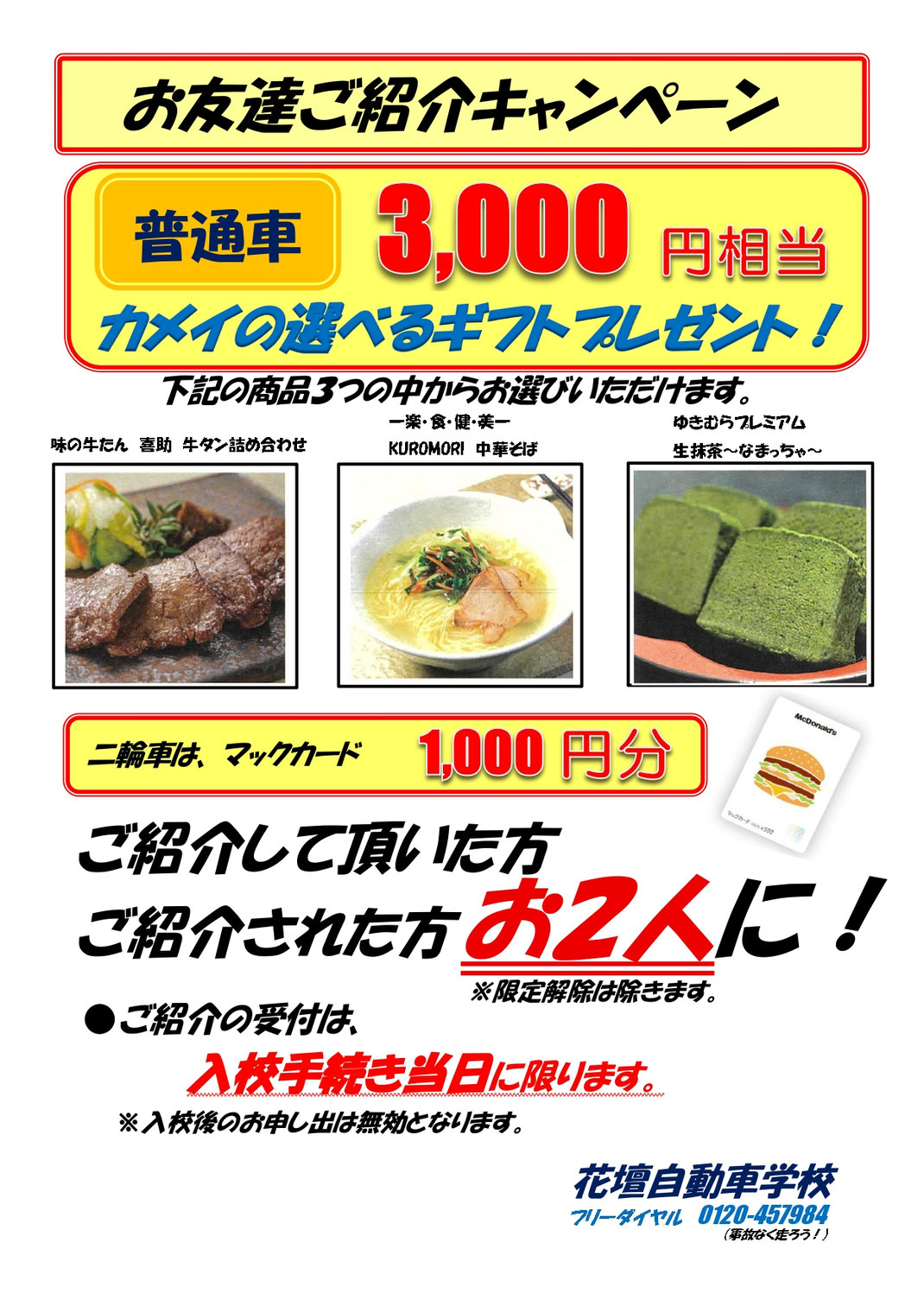 ただいま花壇自動車学校では、クオカード3,000円プレゼントキャンペーン実施中です!